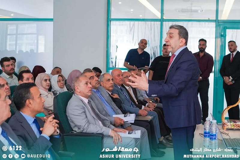 الاصطناعي” في يوم السبت الموافق 2024/4/27 في كلية الهندسة جامعة اشور وبحضور السيد رئيس جامعة اشور الاستاذ الدكتور كاظم عبود الماجدي المحترم والسادة مساعدي رئيس الجامعة وعمداء الكليات وعدد من الطلبة ، أوضح الجميلي بأهمية تعلم طلبة مهارات الثورة الصناعية الرابعة والتي هي امتداد الى ثورة الصفرية والتي بدأت بغداد . واشار الجميلي الى مخاطر الذكاء الاصطناعي التوليدي وخطط المكتب المستقبلية للحد من هذه المخاطر